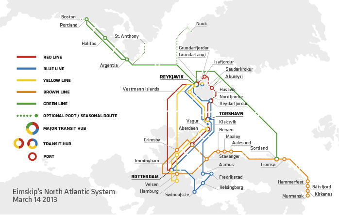 Eimskip har 17 skip som trafikkerer flere havner i Nord-Europa – og nå også Nord-Amerika. I Barentsregionen anløper de Sortland, Tromsø, Hammerfest, Båtsfjord og Murmansk.