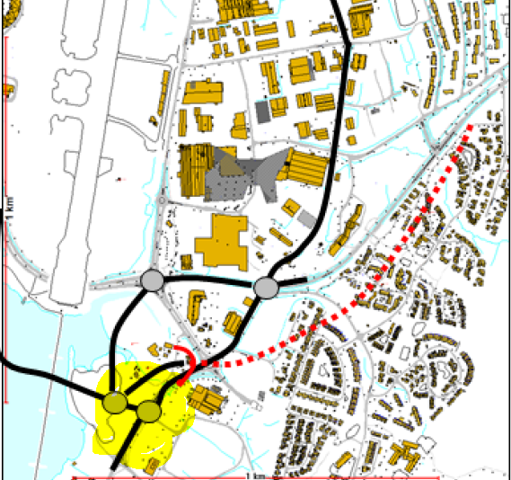 Illustrasjon fra Tromsø kommunes områdeplan for Langnes som viser en mulig plassering av nytt veisystem med kryssområder sør for Postterminalen (en Tverrforbindelse i tunell kan trekkes lengre sør enn det denne illustrasjonen viser):
