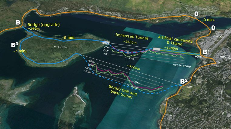 Det sistnevnte vedtak kan understøttes av vurderinger Rambøll har gjort. Rambøll mener at det er verdt å vurdere senketunnel som en del av den videre planleggingen. En mulighetsvurdering som er gjort, viser at det kan bygges en 1 600 m lang senketunnel og en 1 200 m lang fylling mellom Giævernes/Giæverbukta og Håkøya. En slik løsning vil gi en forbindelse som er 2,5 – 3 km kortere enn det som er foreslått av Statens vegvesen: de har foreslått en undersjøisk tunnel på 6,6 km.